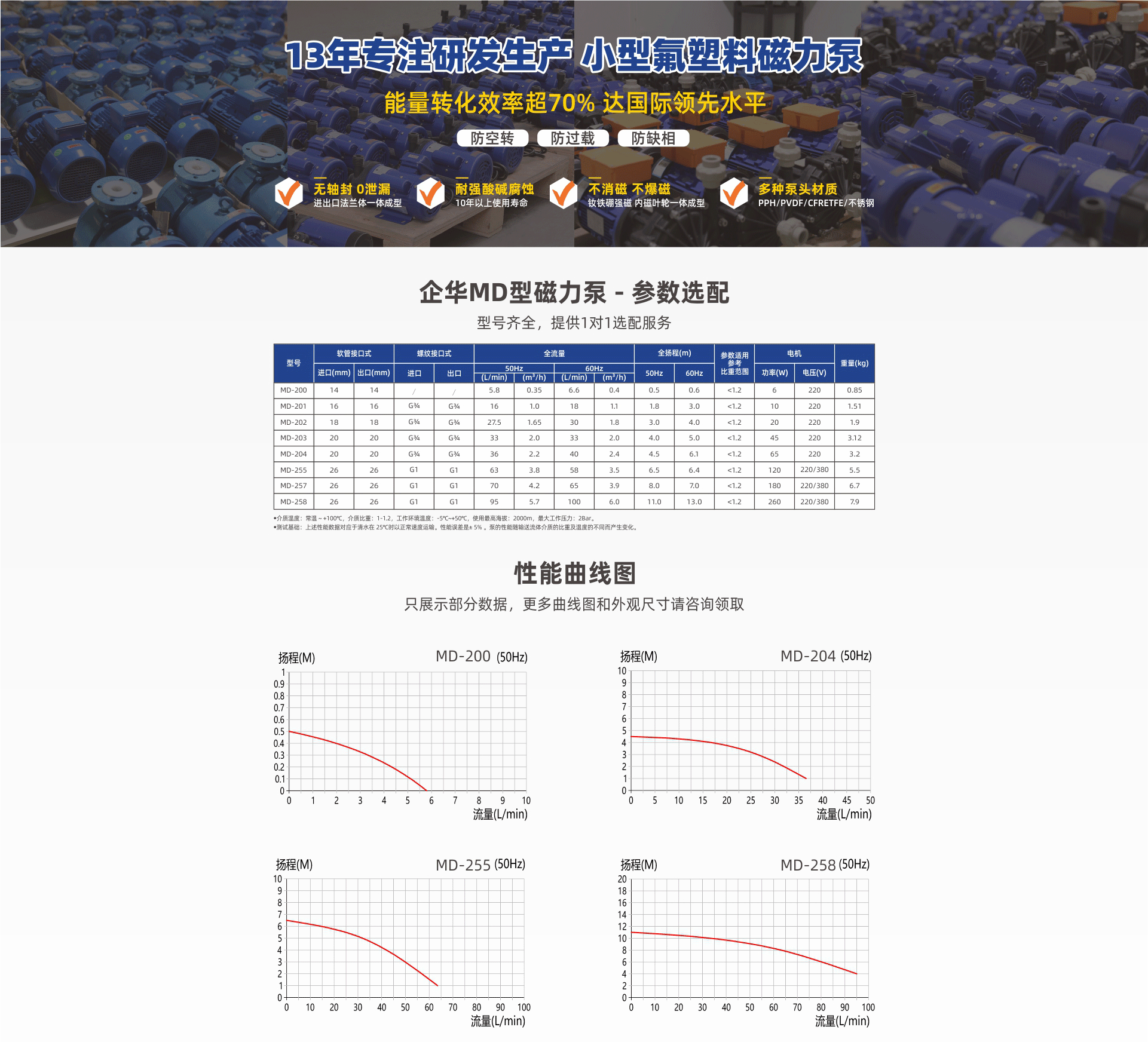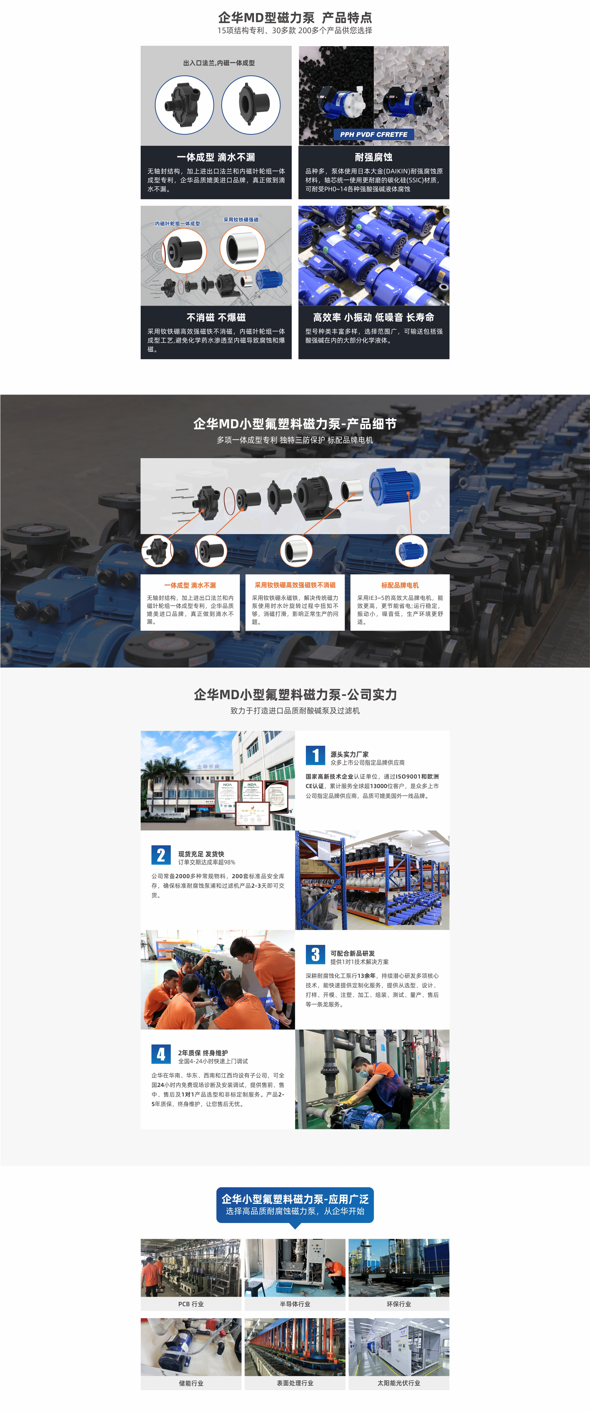 耐強腐蝕,進出口法蘭一體成型專利滴水不漏;采用釹鐵硼高效強磁不消磁,內磁葉輪一體成型不爆磁;多種泵頭材質、體積小、振動小、噪音低、壽命長。